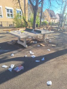 Auf unserem Südhof entsteht ein neues Spielangebot für unsere Schülerinnen und Schüler und in den Osterferien wurde dort fleißig gearbeitet. Leider waren aber nicht nur unsere Handwerker an der Arbeit, sondern am Mittwoch, den 8. April haben wir den Schulhof rund um die Tischtennisplatte extrem verwüstet vorgefunden. Müll, verbrannte Grillkohle und Ketchup-Reste waren überall verstreut…
